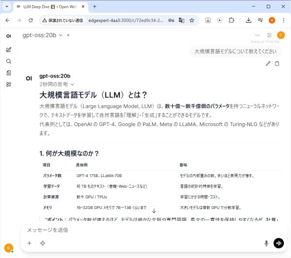 「大規模言語モデルについて教えてください。」と入力し、回答を生成した画面