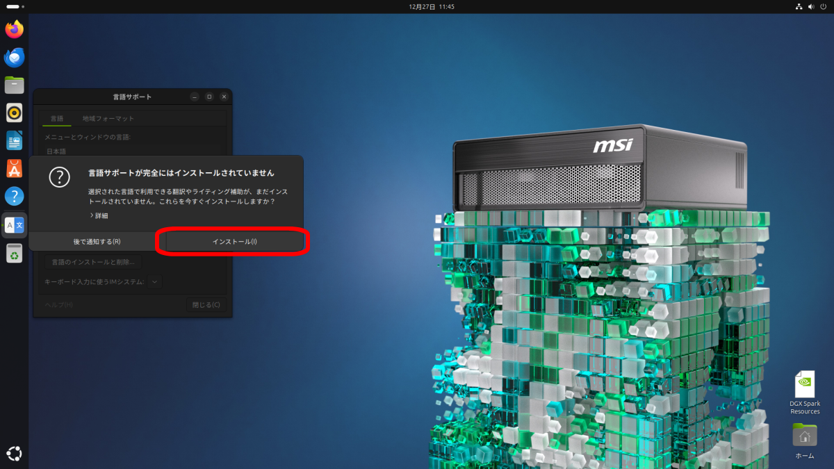 「言語サポート」ウインドウが表示され、「言語サポートが完全にはインストールされていません」ウインドウが表示されます。