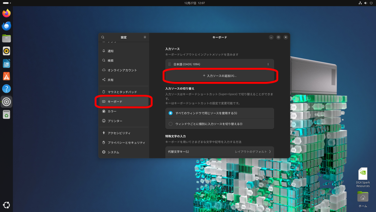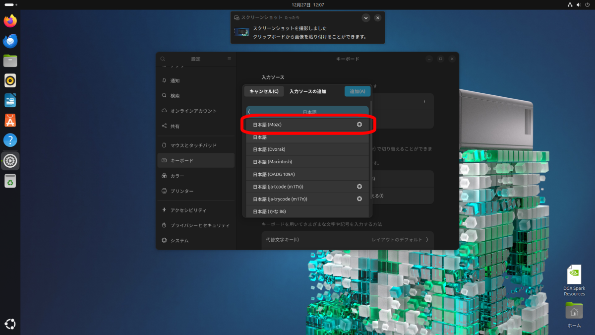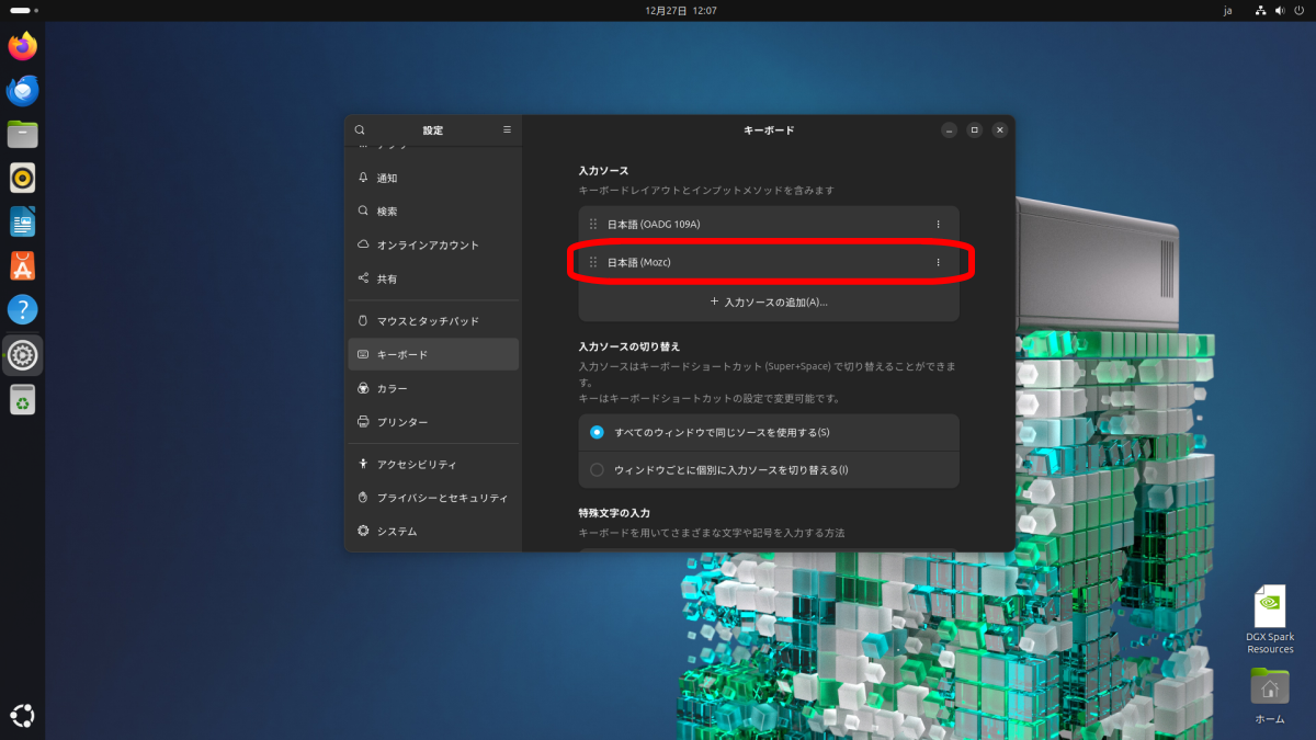 「日本語 (Mozc)」が入力ソースに追加されます。