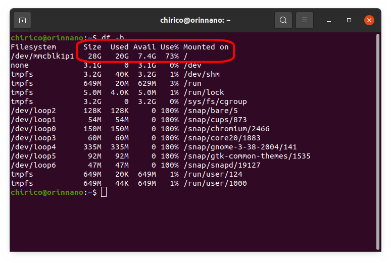 ディスクの空き容量を確認するには、以下のコマンドを実行します。