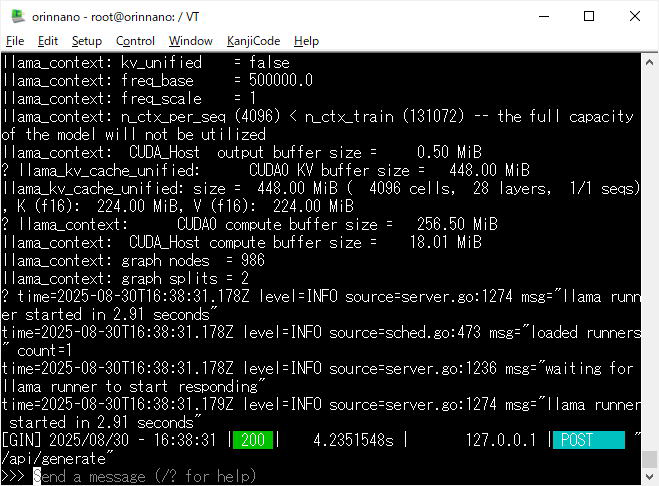 初回実行時は、LLMモデルファイルのダウンロードがあり時間を要します。(時間は、ネットワーク環境等に依存します)