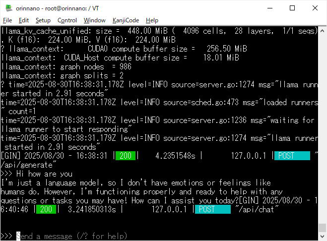 Ollamaサーバーはバックグラウンド起動しているので、同じTerminalでコマンドの入力が可能です。