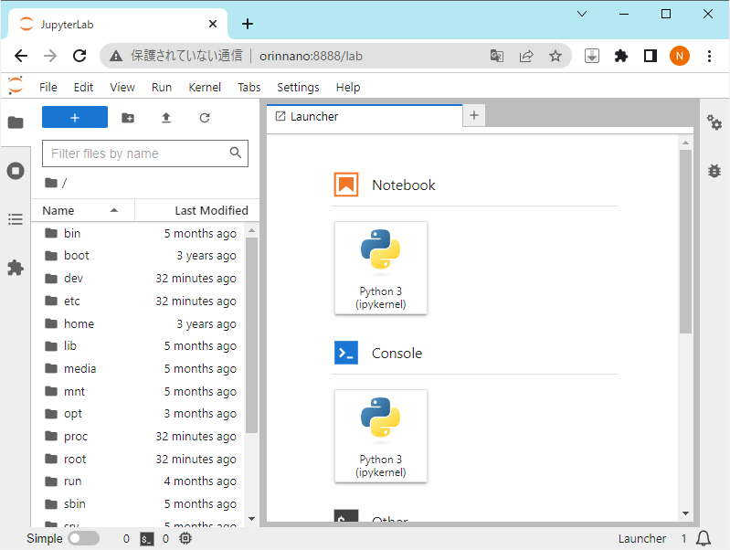 同一ネットワーク上のPCのChromeから「http://[Jetson Orin Nano のホスト名]:8888」にアクセスした際の画面