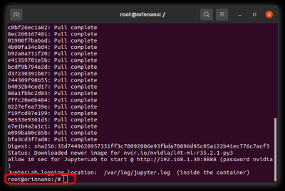 「L4T ML」コンテナを起動すると、以下のようなメッセージが表示され、JupyterLabサーバーも起動します。(IPアドレス部は、実行する