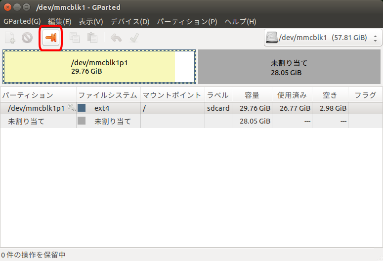 - 移行先microSDカードの未使用領域を既存のルートディスク(「/」ディスク)のリサイズにより割り当てます。