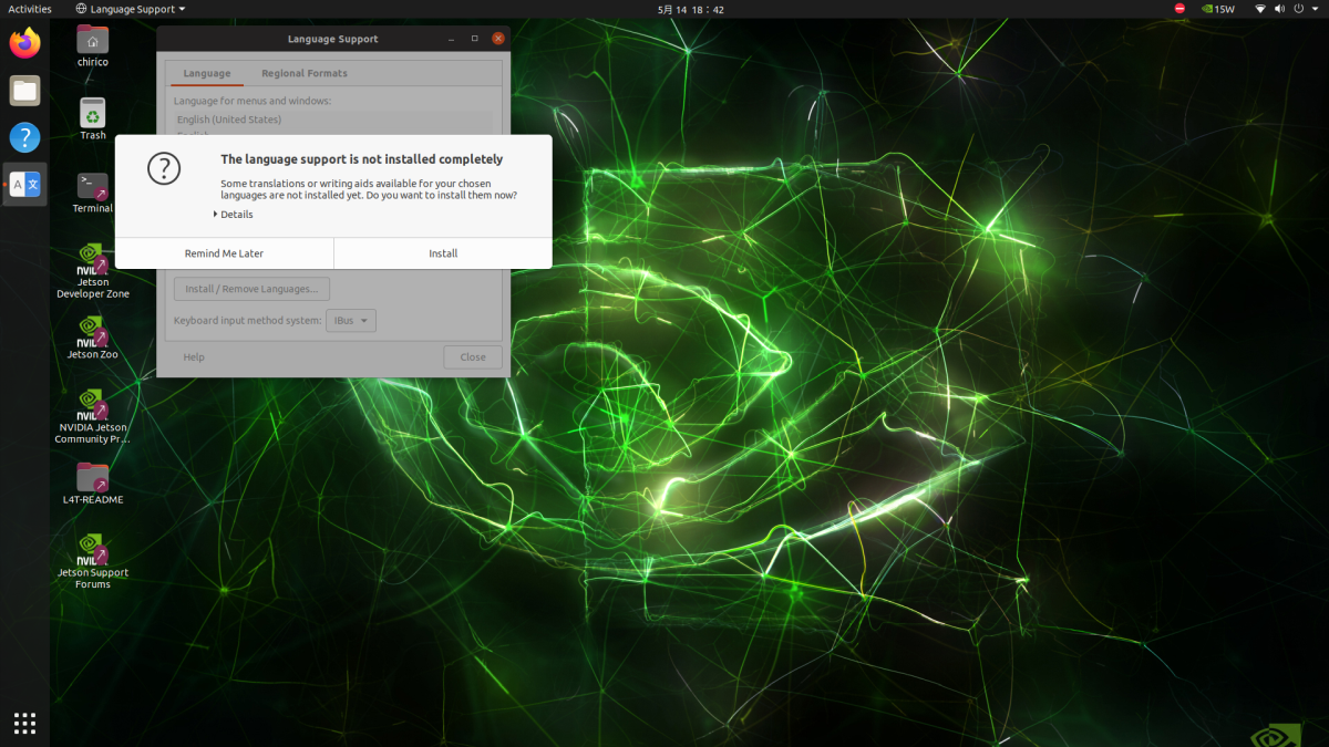 「言語サポート」ウインドウが表示され、「The language supoort is not installed completely (言語サポートが完全にはインストールされていません)」ウインドウが表示されます。