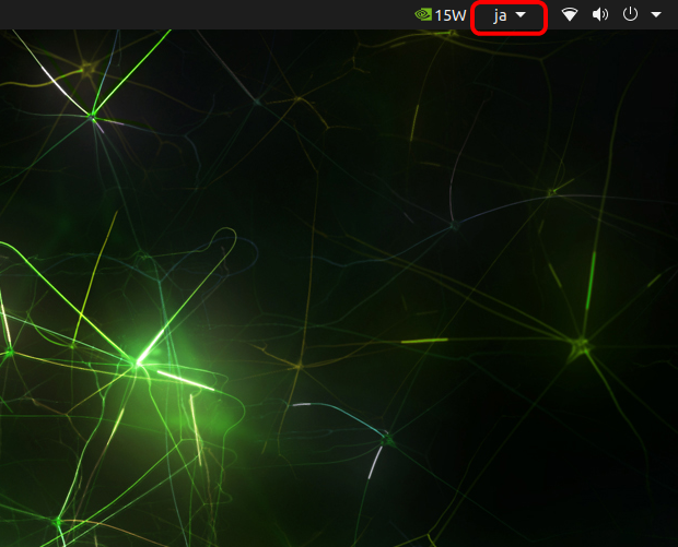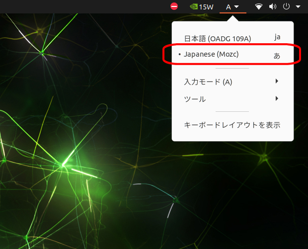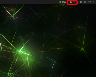 デスクトップ右上隅のテキスト入力アイコンをクリックし、表示されるメニューから「Japanese (Mozc)」をクリックし、選択します。