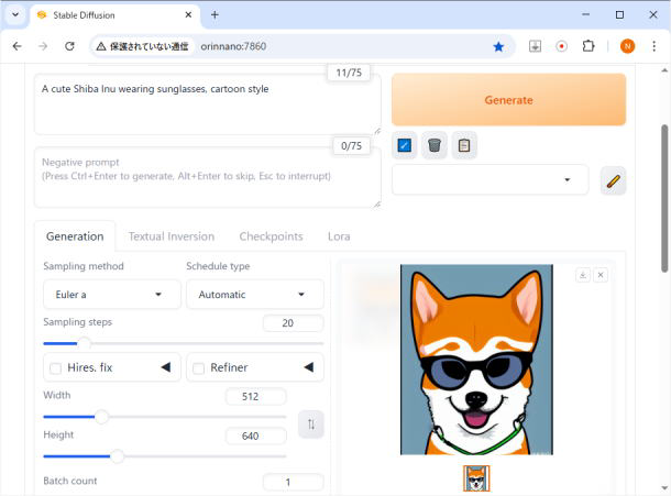 「Prompt」エディットボックスに生成したい画像についてのテキストを入力し、「Generate」ボタンをクリックすると、画像生成が開始します。