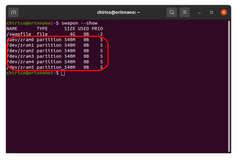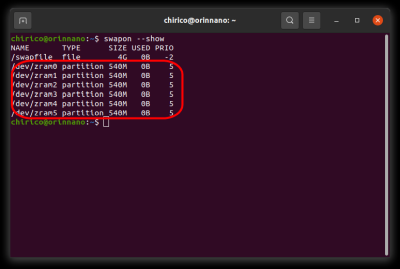 この Jetson Orin Nano には、初期設定のスワップ領域として、3.2GBのスワップ領域が既に設定されていますが、このスワップ領域は、ZRAMと呼ばれる領域に作成されています。