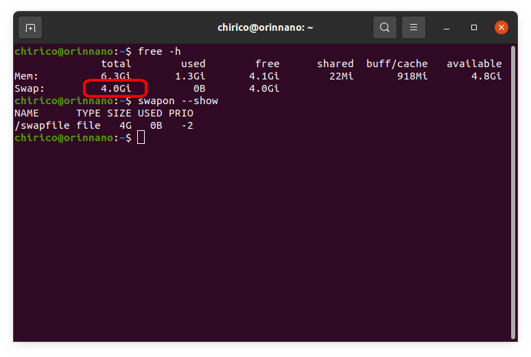 以下のコマンドを実行し、スワップ領域の容量を確認します。