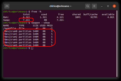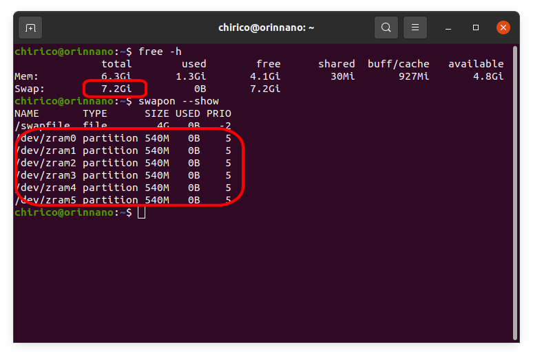 ZRAMが有効化され、スワップ領域のサイズは、7.2GBになりました。