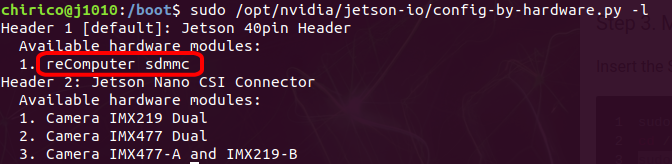 以下のコマンドを実行し、認識したmicroSDカードデバイスのデバイス名「reComputer sdmmc」を指定し、作成したデバイスツリーオーバーレイを適用します。