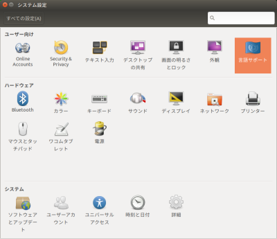 「言語サポートが完全にはインストールされていません」ダイアログが表示された場合は、「インストール」ボタンをクリックし、不足しているソフトウェアをインストールします。認証ダイアログが表示されるので、ユーザーパスワードを入力し、認証します。