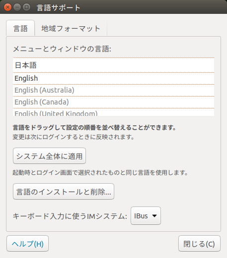 「閉じる」ボタンをクリックし、「言語サポート」ダイアログを閉じます。