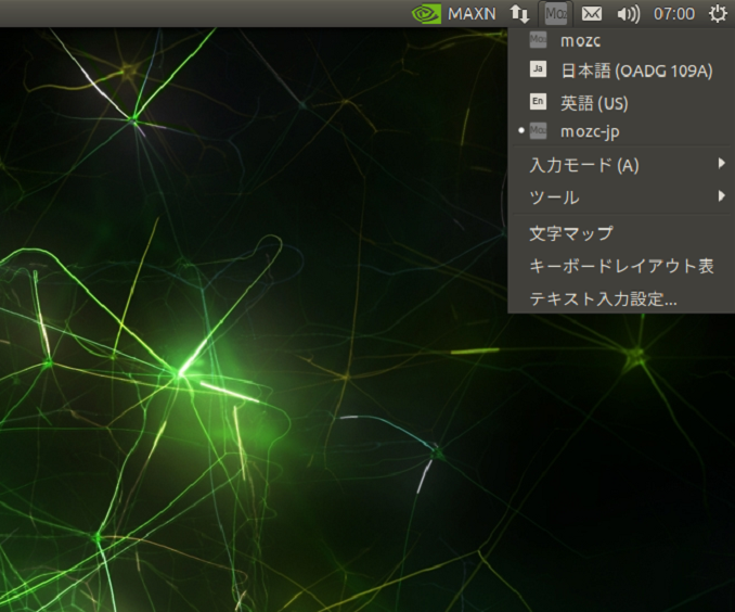 再起動後、デスクトップ右上隅のテキスト入力アイコンをクリックし、表示されるメニューから「mozc-jp」をクリックし、選択します。