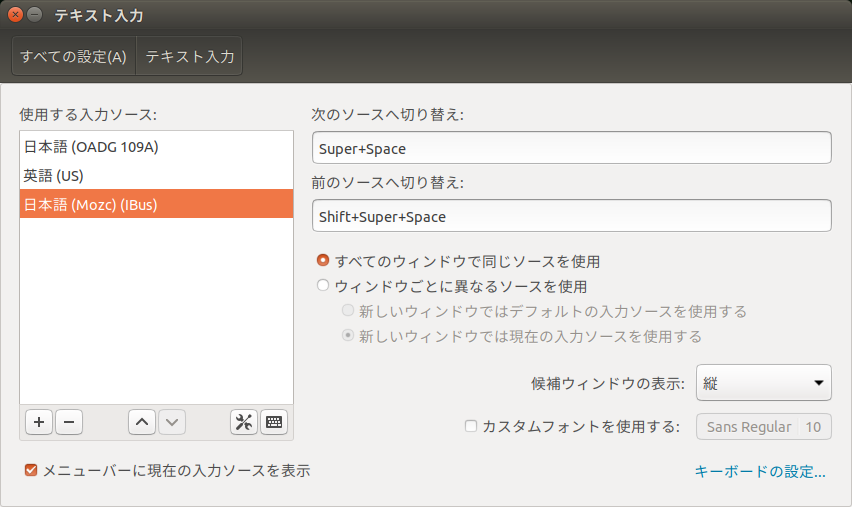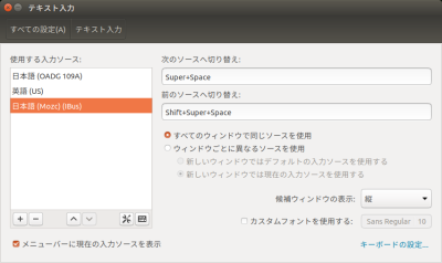 「+」ボタンをクリックし、入力ソースとして、「日本語 (Mozc) (IBus)」を追加します。