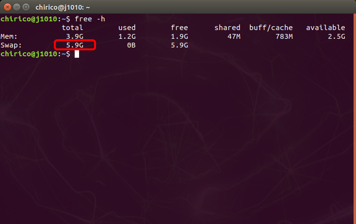 スワップ領域として、4GB拡張され、スワップ領域のサイズが5.9GBとなりました。