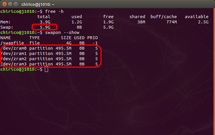 ZRAMが有効化され、スワップ領域のサイズは、5.9GBになりました。