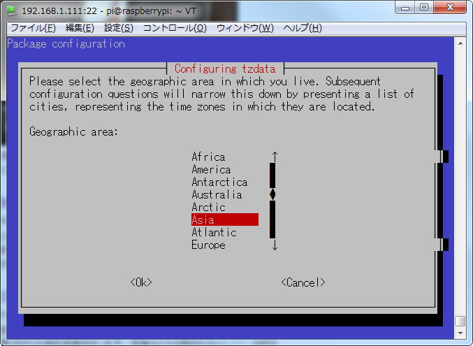 以下のコマンドを実行し、表示される設定画面にて、Asia > Tokyo を選択し、タイムゾーンをJST(Japan Standard