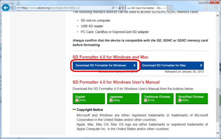 「SD Formatter 4.0」のzipファイルをダウンロードします。