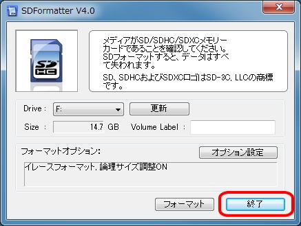 「終了」ボタンを押して、SD Formatter 4.0 を終了します。
