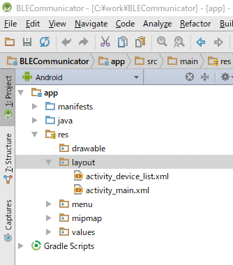 - 「メインアクティビティ」とは別に、「BLEデバイス検出アクティビティ」を用意します。