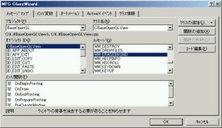 ClassWizardを用いて、ベースOpenGLビュークラスにWM_ERASEBKGNDメッセージに対応するメッセージハンドラOnEraseBkgndを追加します。