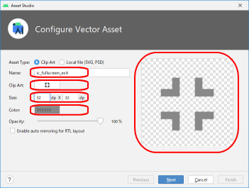 - 「フルスクリーン」「フルスクリーンからの終了」のボタンのイメージを作成します。